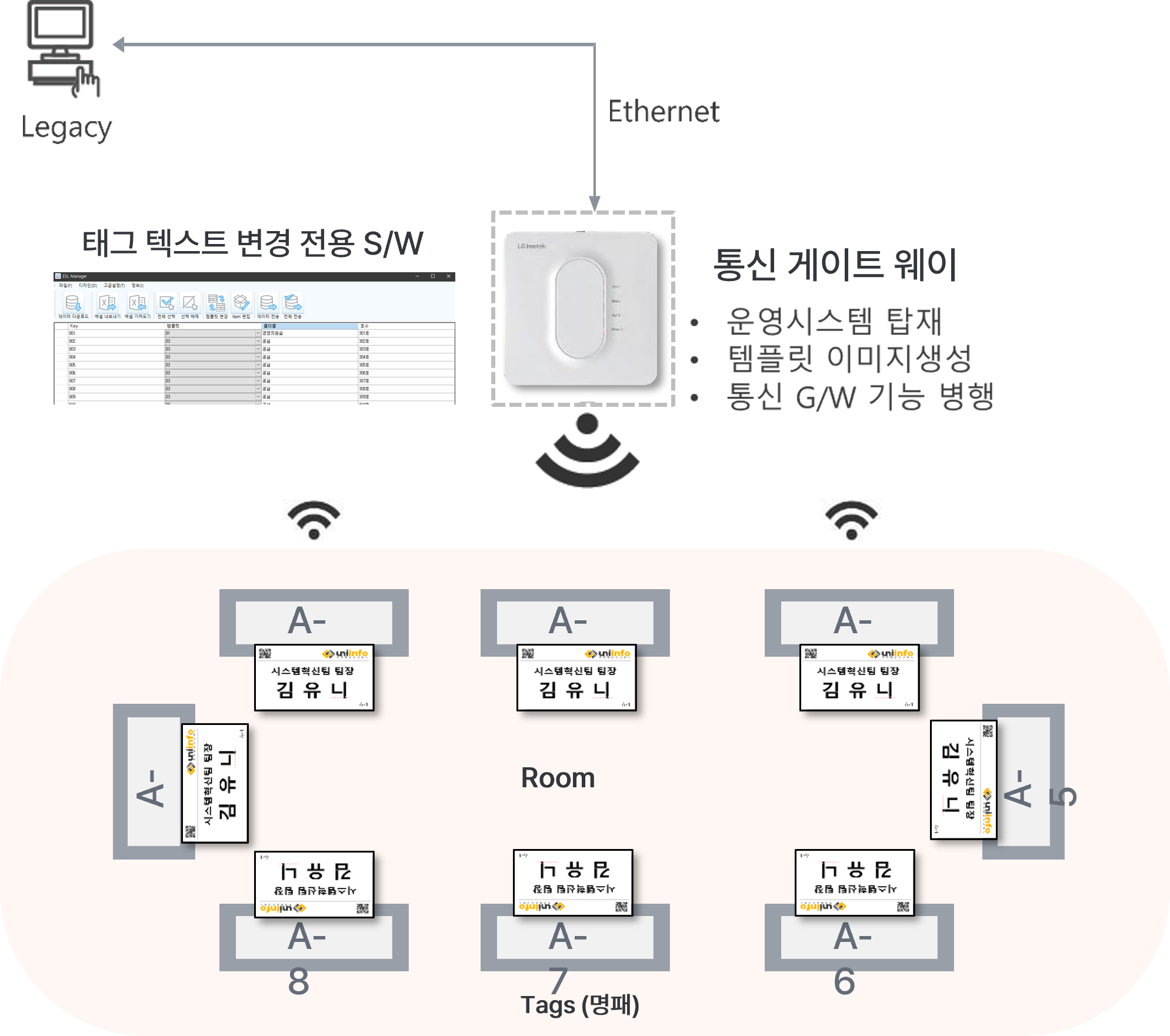 전용 소프트웨어와 게이트웨이 설치만 하면 언제든 손쉽게 이름표의 내용을 변경할 수 있습니다.