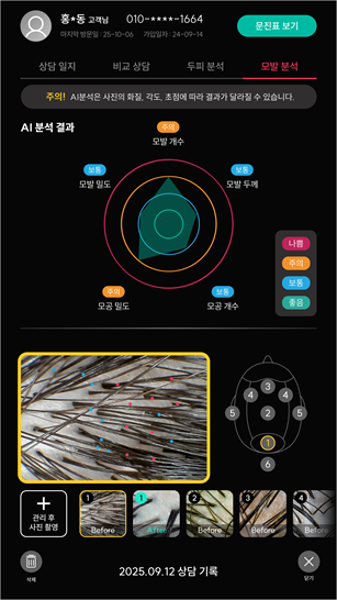 AI가 모발 밀도와 두께 등 6가지 항목을 정밀 진단하고 그 결과를 시각화하여 학생들이 직관적으로 파악하도록 돕습니다. 일자별 상담 이력과 고해상도 전후(Before & After) 사진이 자동으로 기록되어, 관리 효과를 체계적으로 비교하고 데이터에 기반해 검증하는 전문적인 실습이 가능합니다.