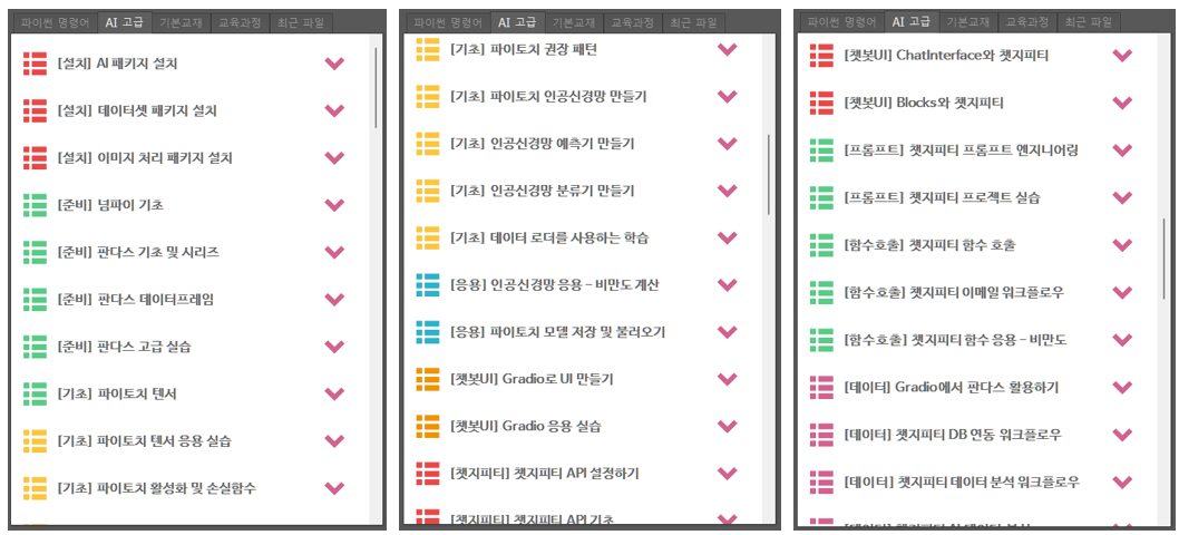 파이썬의 초급 부터 고급 과정 까지 단계별 수준에 맞는 교재와 AI의 넘파이, 판다스, 파이토치, 인공신경망, ChatGPT API까지 고급 콘텐츠, AI 고급부터 기본 교재, 교육과정별로 30차시 이상의 AI 전문가 과정 교재를 모두 담았습니다.