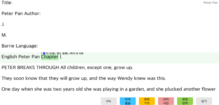 수준별 영문 소설, 수능 기출 지문, 사용자 입력 지문 등을 자동으로 번역하고, TTS (Text-to-Speech / 텍스트 음성 변환) 기능을 통해 단어와 문장을 편리하게 학습할 수 있습니다.